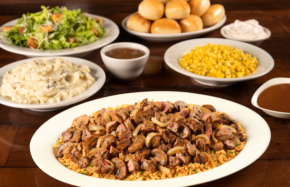 Cuts of steak with sautéed mushrooms, onions, brown gravy and sour cream over seasoned rice or mashed potatoes and one side.